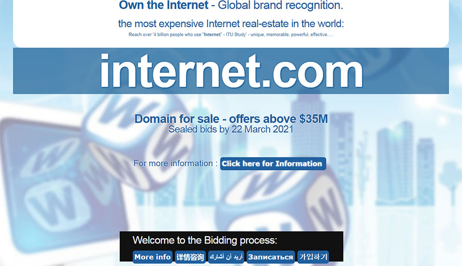 訪問(wèn)域名Internet.com顯示,在2021年3月8日之前,可以接受購(gòu)買(mǎi)Internet.com的投標(biāo)書(shū)。然后將邀請(qǐng)10個(gè)出價(jià)*高的投標(biāo)人參加2021年3月11日在Zoom舉行的現(xiàn)場(chǎng)拍賣(mài),由專(zhuān)注拍賣(mài)商管理拍賣(mài)。