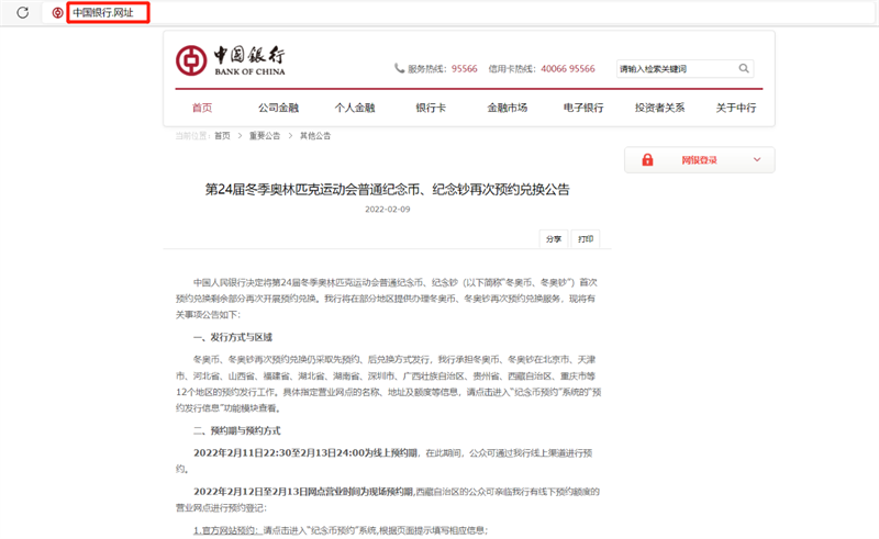 以中國銀行為例,在瀏覽器地址欄輸入“中國銀行.網(wǎng)址”即可進(jìn)入中國銀行官網(wǎng)進(jìn)行預(yù)約。消費者進(jìn)入官網(wǎng)后,點擊進(jìn)入“紀(jì)念幣預(yù)約”系統(tǒng),根據(jù)頁面提示填寫相應(yīng)信息,即可成功預(yù)約冬奧紀(jì)念幣、紀(jì)念鈔。