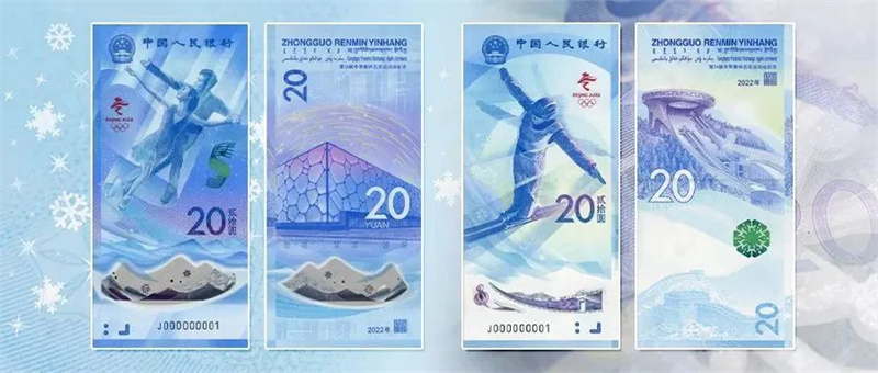 據(jù)了解,本次冬奧會紀(jì)念鈔一套分為兩張,均采取亮眼的藍(lán)色冰雪設(shè)計,其中印有冰上運動的紀(jì)念鈔為塑料鈔,印有雪上運動紀(jì)念鈔為紙鈔,并在其防偽水印上,印有正在滑雪的“冰墩墩”水印圖案。此外,在面值上,紀(jì)念鈔面額為20元,紀(jì)念幣為5元。