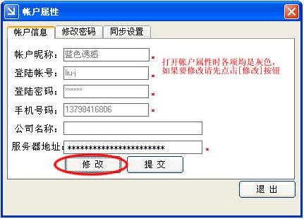 (5)帳戶屬性:當您已經(jīng)建立好一個帳戶以后,您還可以通過帳戶屬性修改該帳戶的一些信息,這些信息包括您在建立該帳戶時輸入的信息包括(帳戶昵稱、登陸帳號、登陸密碼、手機號碼、公司名稱、服務(wù)器地址)以及登陸帳號的密碼和是否開啟自動同步功能。修改帳戶屬性如下圖:帳戶->屬性