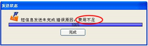 (4)發(fā)送短信:當短信內(nèi)容不為空,接收人也不為空時,就可以點擊[開始發(fā)送]發(fā)送短信。發(fā)送過程中會有一個進度顯示框顯示發(fā)送的進度,如果由于某中原因發(fā)送沒有完成,進度顯示框上會顯示發(fā)送失敗的原因,如下圖: