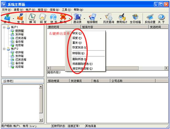 短信管理功能主要是對信箱里短信的各項操作,這些操作包括:接收短信、發(fā)送發(fā)件箱里的短信、回復(fù)短信、轉(zhuǎn)發(fā)短信、重發(fā)短信、恢復(fù)發(fā)送短信、刪除短信、轉(zhuǎn)移短信。