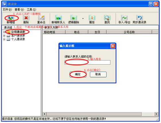操作步驟:首先選定一個通訊錄或通訊錄中的一個聯(lián)系人組,然后點擊工具欄->新增組,彈出要求輸入聯(lián)系人組名稱的輸入框輸入組名,點擊[確定]即可。具體操作可見下圖: