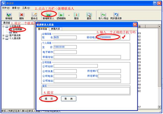 操作步驟:首先選定通訊錄中的一個聯(lián)系人組,然后點擊工具欄->新增聯(lián)系人,彈出新增聯(lián)系人窗口,填寫必要的信息后,點擊[提交]即可。具體操作可見下圖: