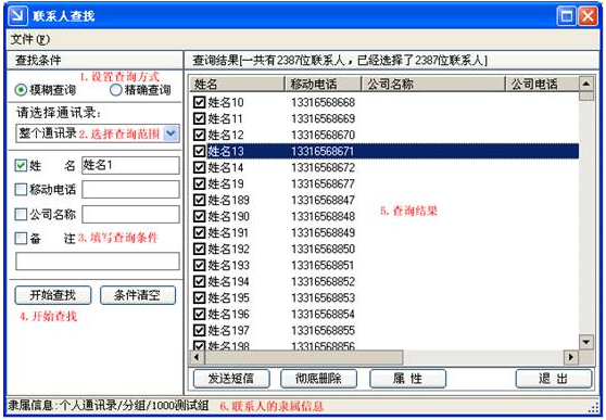 (3)查找聯(lián)系人:可通過姓名、手機號碼、公司名稱、備注等信息在整個通訊錄或是指定的通訊錄中進行模糊或精確的聯(lián)系人查找。
