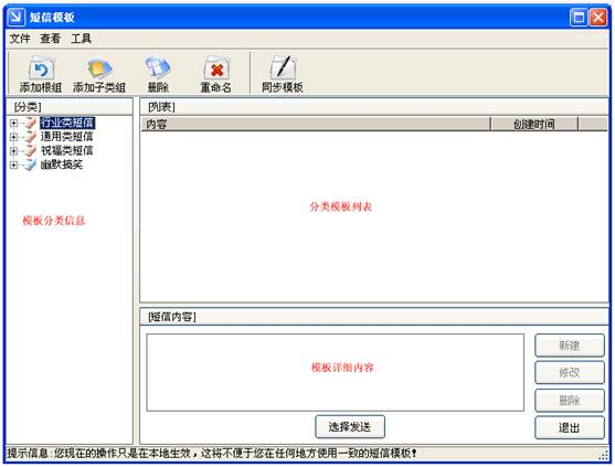 短信模板在主界面的“工具欄”上和“菜單欄->工具->短信模板”上。