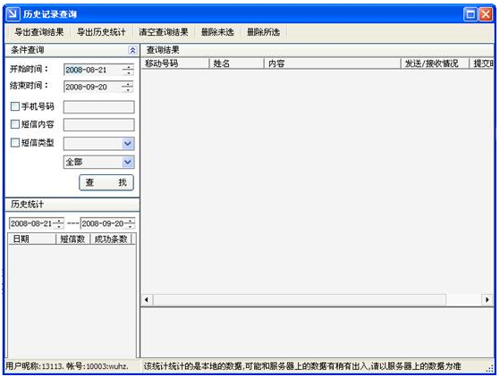 歷史查詢功能:該功能主要實現(xiàn)對短信發(fā)送記錄的查詢和發(fā)送成功數(shù)量的歷史統(tǒng)計,以及對查詢的短信息進行重發(fā)操作。