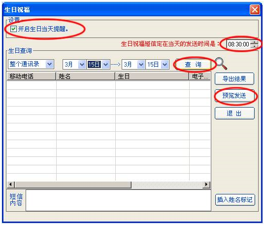 (3)查找/預(yù)覽發(fā)送:要發(fā)送生日祝福短信首先需要按照指定日期進行[查找],如果查找有結(jié)果則可以根據(jù)該查找結(jié)果進行[預(yù)覽發(fā)送],同時也可以[導(dǎo)出結(jié)果]以便進行其他處理。